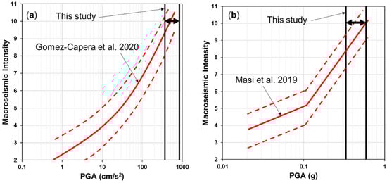The 1703 earthquake destroyed 44 villages in an area of approximately 19,000 km2 and the estimated casualties were about 6000 [29]. In L’Aquila, the city closest to the epicenter (about 12 km), an MCS intensity of about 9 was estimated considering that all the buildings in the city suffered damage and at least 35% of these collapsed completely [40,41].