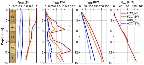 The interpretation of surface wave tests (MASW), obtained through the software Easy MASW by Geostru (https://www.geostru.eu/shop/software/software-geofisica/prova-sismica-multicanale-masw/ (6 December 2021)), provided an estimate of VS to a depth of about 30 m, greater than the 15 m investigated by the down-hole. Figure 12a shows the comparison of the VS profiles obtained from down-hole and MASW. The VS profiles interpreted from MASW along two perpendicular alignments (M1, M2) are quite similar, indicating a limited influence of local stratigraphic variations across the investigated area. Some difference between VS from DH and MASW is observed in the upper 15 m, where both are available. VS obtained from DH is generally higher than VS from MASW, with remarkable differences especially in the first 4 m and between 6 and 9 m, where the DH interpretation leads to values 40% higher.