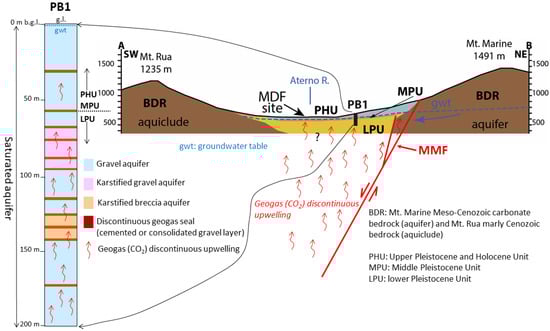 (a). Geological and hydrogeological map of the UAV modified after [52,56,60]. Legend: PHU = Late Pleistocene and Holocene deposits, MPU = Middle Pleistocene deposits, LPU = Lower Pleistocene deposits, BDR = Meso-Cenozoic bedrock, 1: box of Figure 5, 2: normal fault, 3: epicentral area of 2 February 1703, earthquake, 4: PB1 borehole, 5: section trace, 6: main underground hydrological flow direction, 7: inflow of Aterno R., 8: outflow of Aterno R. In the lower box (b), geological section crossing the UAV and reporting the hydrogeological setting modified from [60].