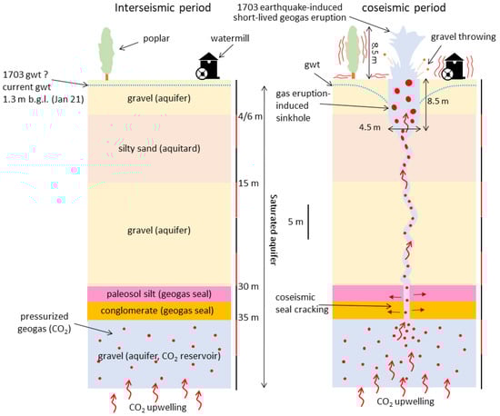 Following the 1703 earthquake, several phenomena also occurred in the environment (among which surface fault rupture, landslide, liquefaction, ground rupture, sinkhole formation, etc.). In this study, the attention is focused on the formation of two sinkholes opened about 175 m apart (“ninety-five steps”) close to the mill at the MDF case study site located in the alluvial plain of the Aterno River, very near to the epicenter of the 1703 earthquake and close to Pizzoli village. Ancient chronicles report that from both these openings sulfurous water of whitish color came out with violence and great noise together with gravels and blocks. One of the two sinkholes, about 3 m wide (“12 spans”) and about 8.5 m deep (“thirty-two palms”), projected the column of water emitted up to a height of about 8.5 m (“four reeds ”) [28,30,31,32,33,34]. The escaped water was collected in a basin, filling the sinkhole itself up to halfway, and lasted for 17 days [20]. Further, considering that the 1703 earthquake happened during wintertime in a rainy and snowy period, the water table of the Aterno River alluvial plain was probably very shallow [43].