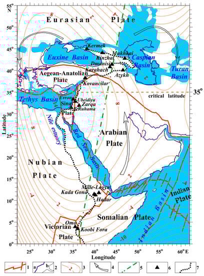 Satellite-derived gravity map with the paleogeographical, tectonic-geodynamic elements and anthropological features. (1) interplate faults, (2) a: modern land-sea boundaries, b: land-sea boundaries during the maximum Akchagylian-Gelasian transgression, (3) residual satellite-derived gravity map, (4) rotation of the Earth′s crust according to the GPS observations, paleomagnetic and structural data, (5) averaged position of the Ural-African Step, (6) ancient hominin sites corresponding to the age Akchagylian-Gelasian transgression, (7) reconstructed early hominin way from Africa to Eurasia ((3) and (4) according to [26,29,60]).