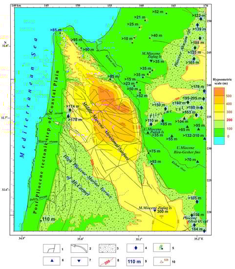 Structural-geomorphological map of the Mt. Carmel area (northern Israel). The following main works were used for this map construction: [33,34,35,36,37,38]. (1) faults, (2) counterclockwise rotation of tectonic blocks, (3) high-level Pliocene marine terrace, (4) points with the Pliocene abrasion conglomerates, (5) Pliocene marine sediments of the Pleshet Formation, (6) Late Miocene marine sediments of the Bira and Patish Formations, (7) Middle Miocene marine sediments of the Ziqlag Formation, (8) most high level of the marine Pliocene transgression (boundary indicating the position of the Miocene islands within the Pliocene marine environments), (9) modern hypsometric data of the Miocene-Pliocene sediments, (10) highest hypsometric points of the tectonically uplifted Miocene marine terraces.