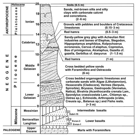 The stratigraphic sequence of the Upper Cenozoic sediments and traps of the Evron Quarry area in northern Galilee (northern Israel). Besides the personal studies of the authors of this paper, the following main works were used for this section construction: [12,15,40,41,88,104,105].
