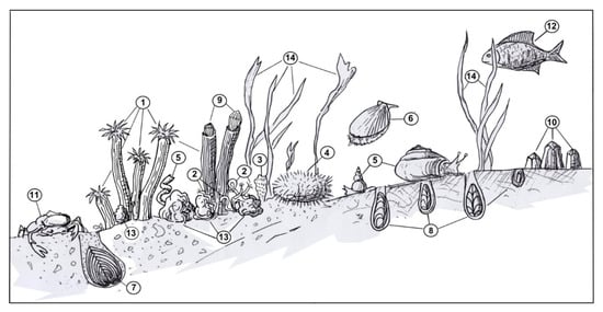 Paleoecological reconstructions of the Early Gelasian (Pleshet stage) marine benthic association of the Evron quarry in northern Galilee (northern Israel) (this figure is composed using the personal experience of the authors). (1) Scleractinian corals (Cladocora sp.), (2) Polychaeta worms (Serpula, Spirorbis), (3) Bryozoa, (4) Echinoidea, (5) Gastropod mollusks (Vermetus, Natica and oth.), (6)–(8) Bivalvian mollusks: (6) Pectinidae, (7) Cardiiidae, (8) Lithophaga, (9)–(11): Arthropods: (9) Creusia, (10) Balanus, (11) Crabs, (12) Fishes, (13)–(14) marine Plants: (13) Lithotamnion biogenic carbonates, (14) thalloid Chlorophycea.
