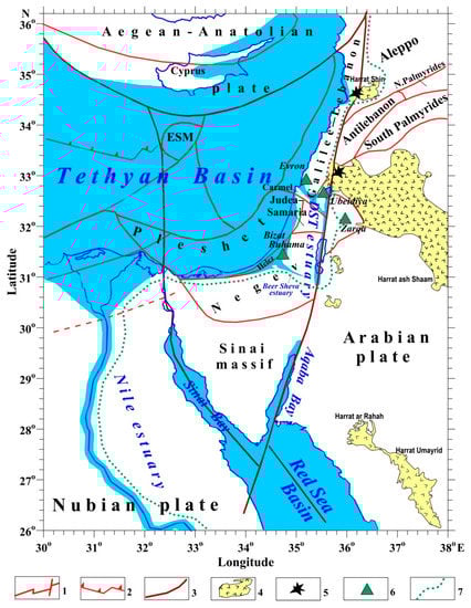 Map of the Levantine Corridor with the significant tectono-geological elements. (1) interplate faults, (2) Mediterranean Ridge, (3) intraplate faults, (4) Pliocene trap fields, (5) Pliocene-Pleistocene volcanoes, (6) ancient hominin sites, (7) Levantine Corridor.