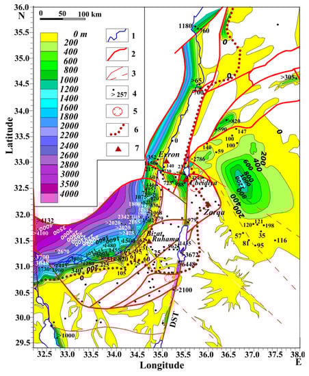 The data of sin-sedimentation tectonics of the Neogene-Quaternary stage (Figure 9) of the Eastern Mediterranean region [10] definitely confirm the uplift of the carbonate platform of the Mesozoic Terrane Belt adjacent to the coastline of the Mediterranean Sea. Equally uplifted were the terrane blocks located east of the DST, as well as the development areas of the Neoproterozoic belt of the Sinai and the Arabian plate, located south of the carbonate platform of the Mesozoic Terrane Belt. The areas of abrupt subsidence in the Late Cenozoic, judging by the drilling data, are the DST rhomboid troughs and the Mediterranean Sea basin, starting approximately from the coastline. A significant difference in thickness of the Late Cenozoic (up to 1500–2000 m) is developed here; magmatic manifestations and zones of tectonic faulting are recorded. Further on the shelf of the Mediterranean Sea, the subsidence increases rather smoothly, and the thickness reaches 3000–4000 m and more (Figure 9).