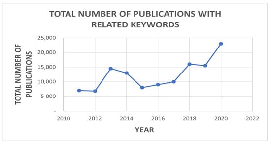 In recent years, there has been increased interest within the scientific community to quantify the uncertainty related to ML models. Figure 1 shows the total number of research publications with the keywords “Machine Learning, Uncertainty Quantification” within 2010–2020. In the context of ML, there are two types of major uncertainty that can be modeled: epistemic uncertainty and aleatoric uncertainty [,,,]. Epistemic uncertainty accounts for the uncertainty in the model parameters. Aleatoric uncertainty is related to the noise inherent in the training dataset itself. The literature consists of examples of different modeling techniques to quantify aleatoric or epistemic uncertainty or both when employing ML models for a specific problem domain. It must be noted that, although quantification of uncertainty can allow its minimization, uncertainty cannot be diminished completely due to the stochastic nature of physical and environmental systems. Uncertainty Quantification (UQ) captures this stochasticity in the form of a probability distribution. Therefore, UQ does not always lead to an increase in accuracy; rather, given the probabilistic nature of UQ, it allows the placement of a confidence interval in the current model output, ensuring reliability.