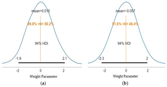 In Bayesian DL, the model parameter and output are derived as a posterior probability distribution instead of a point estimate. Given a probability distribution, theories in statistics dictate that a confidence interval can be placed. This confidence interval ensures the reliability of the model prediction. The Bayesian CNN and BNN implemented in the two case studies exhibits the point mentioned above. Figure 3a,b represent the posterior probability distribution for an instance of a weight parameter of the Bayesian CNN and BNN, respectively. Both were obtained during a training iteration of their respective models. The mean weight for Bayesian CNN and BNN is 0.015 and −0.057, respectively. In both cases, the standard deviation is around . The standard deviation is a quantification of the level of model parameter uncertainty (epistemic uncertainty) that the models incur during that particular iteration of training. The 94% Highest Density Interval (HDI) represents the credible interval for the weight parameter. A credible interval can be thought of as the Bayesian counterpart of frequentist probability theory’s confidence intervals. An interpretation of this credible interval is that 94% of the area under the distribution will lie within these credible bounds. Therefore, a smaller credible interval is preferred to a larger one, as it will ensure lower variance or dispersion of the distribution.