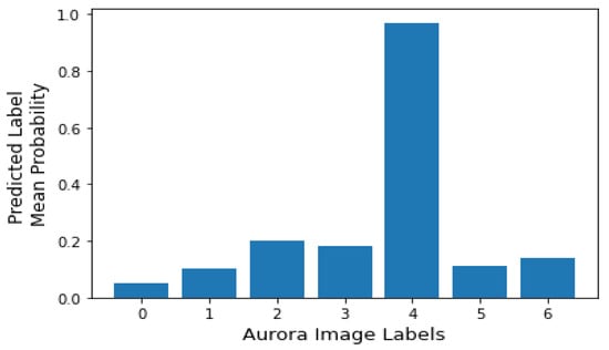 When the Bayesian CNN receives an observation from the test set, it calculates the posterior probability of that particular observation being part of a specific label. It reports the mean probability of a particular label within the 98% probability. Figure 4 shows the result of an instance when the test image belonged to label-4. Figure 5a illustrates an instance of the aurora image label-6 (faint clear), and Figure 5b represents a noisy image. After both the standard and Bayesian CNN model is trained, when the image in Figure 5a is the input, both the aforementioned implemented CNNs could classify it to the correct label. However, when the noisy image in Figure 5b is the input, the Bayesian CNN model generates the mean probability of the input image belonging to a particular label, and the probabilities tend to be very low. In contrast, when the noisy is the input to the standard CNN, it classifies the noisy image as one of the labels. This exercise exhibits the unreliability of a Non-Bayesian DL approach due to its inability to make probabilistic inferences about uncertainty. Within the context of a classification problem, the mean classification probability represents the level of confidence in the model results. The Bayesian CNN model has a classification accuracy of 83.04%, where the classification accuracy is calculated as shown in Equation (27).