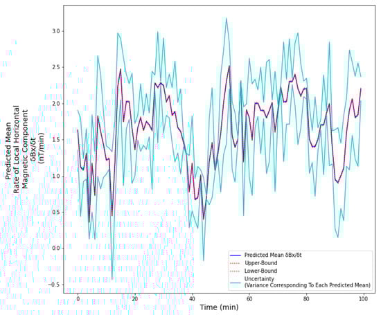 In case of the GIC prediction case study, similar to Reference [] (2020), the rate of change in local horizontal magnetic component () is used as a proxy measure for GIC. The dataset used in this paper consisted of ground magnetometer data from Ottawa (OTT), obtained from SuperMAG []. SuperMAG is an association of organizations and national agencies from around the world that currently operate more than 300 ground-based magnetometers. The dataset also consisted of solar wind data from OmniWeb, NASA’s Space Physics Data Facility. For this study, the data from the years 2001–2018 was taken into consideration. The input data was the vector , consisting of , , and components of the solar wind magnetic field; and flow pressure, proton density, speed, and solar wind temperature, obtained from the OmniWeb dataset. The output variable, y, is the rate of change of local horizontal magnetic component (). The local horizontal magnetic component, , was calculated from the dataset, as shown in Equation (26). The rate of change of local horizontal magnetic component, , is the difference between consecutive over a time frame of 1 min. The training dataset consisted of the years 2001–2010, and the test dataset consisted of the remaining years. Given our dataset, the analysis focuses on dayside GIC. A BNN model was implemented to predict , where it makes the prediction with 95% confidence interval. The model consisted of five hidden layers, and it performs Variational Inference (VI).