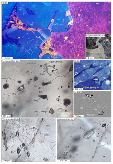 In contrast, the presence of SiO2-rich fluid inclusions is significant because only a few previous studies have reported similar inclusions [3,18,19,21,22,51,62,65,66,67,68]. These inclusions have pronounced faceting and currently contain variably crystallised and hydrated SiO2, including opal-A and opal-CT that were never properly documented before. Variations in crystallinity and hydration are probably caused by a maturation process that converts the matter inside these inclusions from an amorphous state to quartz and leads to H2O loss. Opal-A, opal-CT and moganite probably represent intermediate products in this process, and the bottom right inclusion in Figure 5e can be interpreted as a snapshot of the transition of opal-CT to moganite. The fact that CL images of perfectly transparent quartz sometimes reveal areas with weak signal that are similar in size and shape to neighbouring inclusions of SiO2-rich fluids probably suggests that the final products of their crystallisation are not always visible. Previous studies reporting similar inclusions with various crystalline SiO2 polymorphs inside have suggested that the trapped SiO2-rich fluid was a silica gel [3,18,19,21,22,62], and we can only concur with this suggestion.