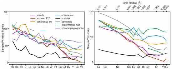 - Polat, A.; Kerrich, R. Magnesian andesites, Nb-enriched basalt-andesites, and adakites from late-Archean 2.7 Ga Wawa greenstone belts, Superior Province, Canada: Implications for late Archean subduction zone petrogenetic processes. Contrib. Mineral. Petrol. 2001, 141, 36–52. [Google Scholar] [CrossRef]