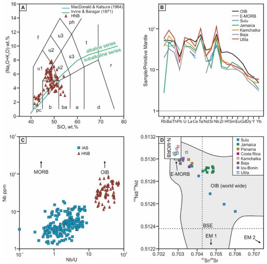 - Sajona, F.G.; Maury, R.C.; Bellon, H.; Cotten, J.; Defant, M.J. High field strength element enrichment of Pliocene-Pleistocene island arc basalts, Zamboanga Peninsula, Western Mindanao (Philippines). J. Petrol. 1996, 37, 693–726. [Google Scholar] [CrossRef]