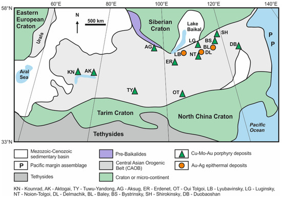 | Duobaoshan cluster (Greater Xin’gan, NE China) | 478–485 Ma and 223–244 Ma | E-w-trending vein clusters, 100–1400 m long, 2–390 m wide (Py, Ccp, Bn, Mol, Po, Gn, Sp, Ttr, Au, Dg, Mlc) | Contained 2,44 Mt Cu (av. 0.52% Cu), 110,00 tons Mo (av. 0.02% Mo), 2.4 Moz Au (av. 0.16–0.35 g/t Au), 34.8 Moz Ag | [258] |