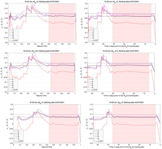 In Figure 9, the computed parameters D, κ1, Snt and Snt−, as evolved event by event, are plotted in the natural time and conventional time domains as they approach the critical stage in the regional seismicity of central Crete, for threshold magnitudes of Mth = 2.0, 2.5 and 3.0 and for areas of radius R = 25 and R = 50 km, respectively, around the epicenter of the Mw6.0 main event. This analysis clearly demonstrates that, from about August 17, 2021 (i.e., about 41 days before the Mw6.0 earthquake of 27 September 2021), the estimated parameters suggest that a critical stage has been approached. In all cases, for Mth = 2.0, 2.5 and 3.0, and R = 25 and R = 50 km, the NT analysis starts at approximately two months before the main event, i.e., 24 July, 2021, around the corresponding time marker indicated by MRWA (see Figure 6, Figure 7 and Figure 8). It may, thus, be considered that the critical point for the regional seismicity was approached around that time. In Figure 9, we observe that all the requirements (i–iv) are fulfilled a few days before the mainshock for all the cases that we study. The results, thus, indicate that the regional seismicity presented criticality characteristics before the main event.
