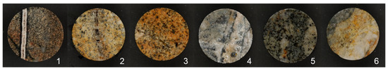 Top view on representative cores (40 mm diameter) from the six samples; the mineralogical composition of the sample and the veins is given in Table 1.