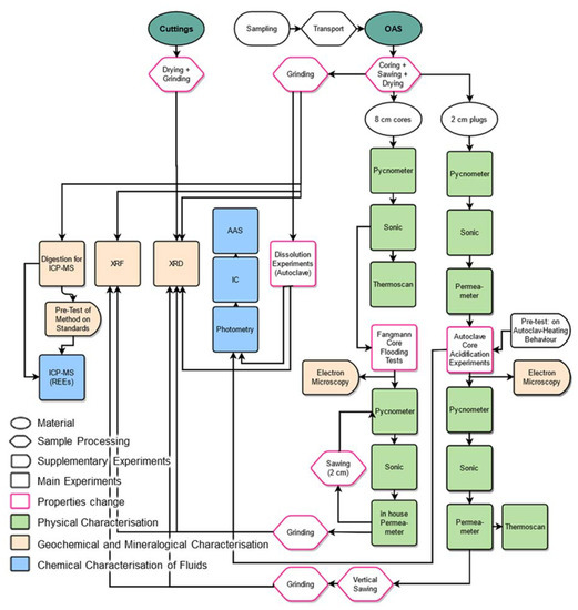 A set of different analytical methods, such as XRF, XRD, AAS, IC, ICP-MS, thermoscanning, helium pycnometry, helium permeametry, water permeametry and sonic velocity, is used to characterise the samples petrologically and petrophysically before and after chemical treatment in AEs and CFTs at reservoir temperatures and pressures, as well as the spent acids from the AEs (Table 2, Figure 3).