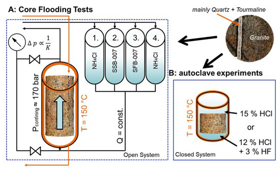 In the CFTs, during the flushing process under the applied confining pressure, a fracture collapse was detected, as described in Section 3.2. This risk is transferable to the reservoir, as it implies the risk of a permeability decrease by the reduction in vein or fissure stability by particle washout or during chemical treatment. In hydraulic stimulations, proppants are commonly used to avoid fracture collapse. In the case of the granitic reservoir rocks, the Quartz grains, however, might act as natural proppants and keep the fractures open, while Micas and ore minerals in the fractures are preferentially dissolved.