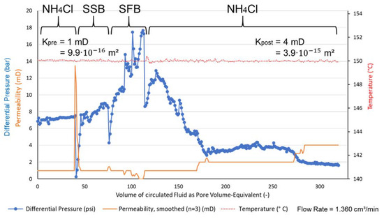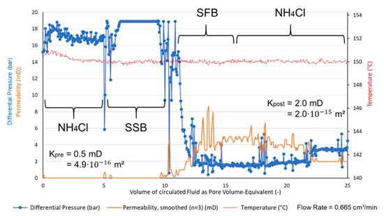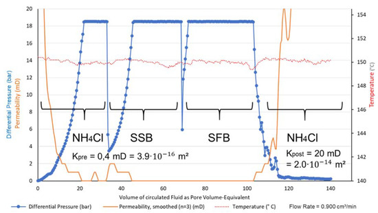 As described in Section 3.2, the permeability can only be measured during the pre- and post-flush. Since the viscosity of the brine (NH4Cl) is temperature dependent, it had to be determined in additional experiments, conducted by Fangmann Energy Services. Nevertheless, to our knowledge, in the data provided by Fangmann Energy Services, which are included in the Supplementary Materials, the viscosity of the fluid was set to 1 cP.