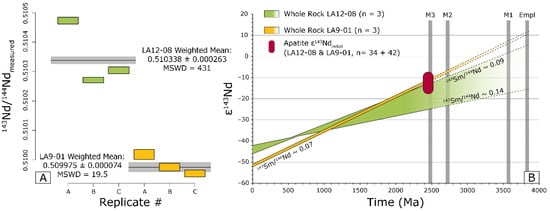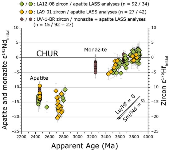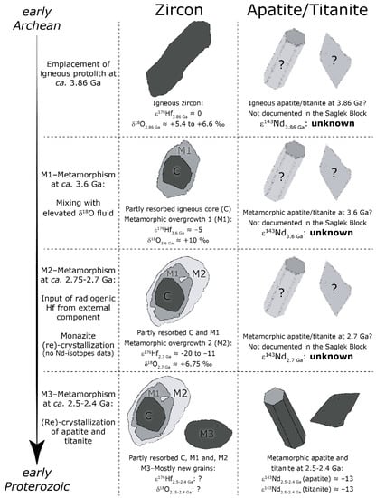 - Igneous activity at ca. 3.87 Ga was sourced from a mantle domain that had experienced only subtle prior fractionation of parent–daughter isotopes, which had incorporated hydrothermally altered material before partial melting. This is based on previously published zircon U–Pb/Hf/O-isotopes analyses [5,47];