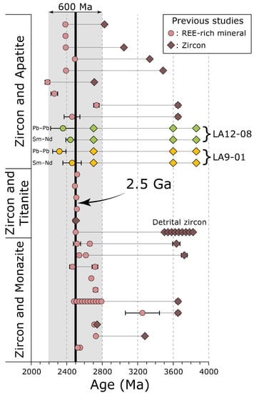 - Late-Neoarchean/early-Paleoproterozoic metamorphism at ca. 2.5–2.4 Ga (+2.2 Ga?). Massive (re)-recrystallization of REE-rich mineral phases at the regional scale, especially apatite and titanite. Sm–Nd isotopes indicated intra-crustal reworking. An accurate dating of the termination of this event cannot yet be constrained, due to the readiness of REE-rich phases to react under low-grade metamorphism in fluid-present environments.