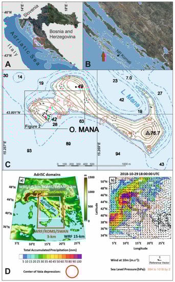 (A) Location map of Croatia and the NP Kornati in Northern Dalmatia. (B) Location map of the island of Mana in Northern Dalmatia. (C) Topographic map of the island of Mana showing morphology and general bathymetry (in meters, https://geoportal.dgu.hr/ accessed on 8 January 2022), and geological structures of the bedrock carbonates (in red: anticlines, synclines, bed strike, dip, and dip angle). (D) (a) Orography used in the AdriSC WRF 15-km model and geographical location of the nested WRF, ROMS, SWAN, ADCIRC, and unSWAN models. (b) Accumulated rain, sea-level pressure, and the winds during the peak of the Vaia storm using the numerical results obtained with the WRF-15km model from the AdriSC modeling suite. The abbreviations are described in Section 3.4.