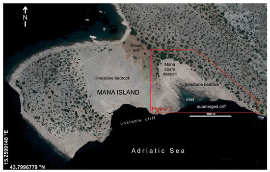 Low-resolution orthophoto image of the SW part of the island of Mana from 2016 (https://geoportal.dgu.hr/ accessed on 8 January 2022), and the notations showing the Mana storm deposit that unconformably overlays Upper Cretaceous limestone bedrock and Quaternary brown soil (NP Kornati, Central Adriatic, Croatia).