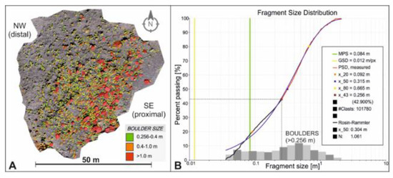 (A) Boulder-size fragment distribution map within the Mana coarse-clast deposits. (B) Fragment size distribution diagram for all detectable fragments and fitted R-R distribution (Fragmenter; 3GSM GmbH). The minimum size of a fragment depends on the 3D point spacing and the image resolution. MPS—median point spacing, GSD—ground sample distance.