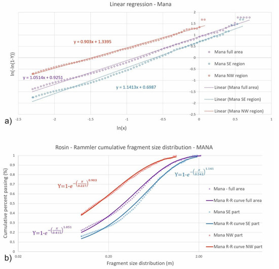 (a) Linear regression for empirical fragment size data; shape parameter for entire area N = 1.051, for proximal (SE) part N = 1.141 and for distal (NW) part N = 0.903 (b) The R-R cumulative fragment size distribution for the entire area, as well as for the proximal (SE) and distal (NW) parts.
