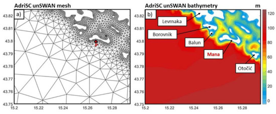 Near Mana Island (Figure 9a), the AdriSC unSWAN model had a resolution ranging from 10 m at the coastline to 1 km further offshore and a bathymetry that captured the main geomorphological features of the seabed (Figure 9b).