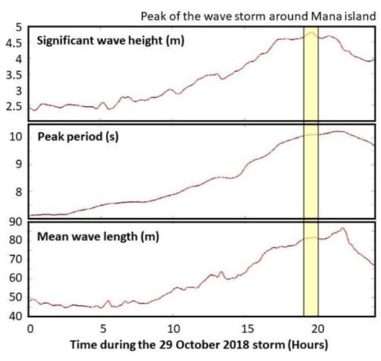 The obtained numerical results (Figure 10) extracted at a point off Mana Island located at a depth of about 42 m (Point P, in Figure 9a) highlighted that the peak of the storm, defined by the peak values of the significant wave height (surpassing 4.5 m), was reached in the evening hours of 29 October 2018, and lasted for about 5 h.
