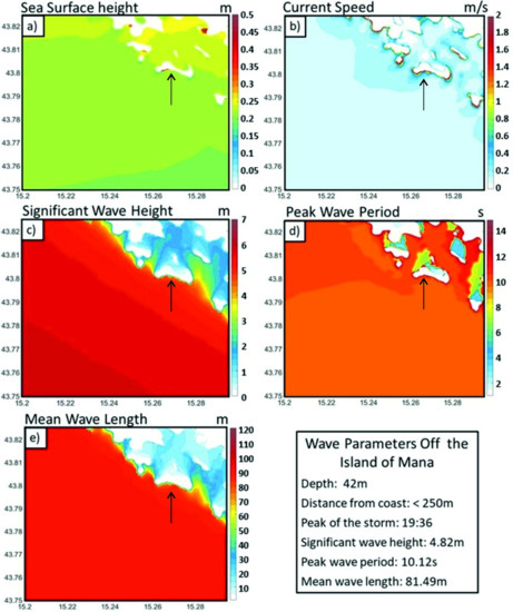 Similarly, according to the AdriSC model (Figure 11), the Mana storm deposit is also under the direct impact of extreme southern waves. While the tsunami hazard is low [18,19], the central Adriatic Sea is exposed to extreme southern to southeastern waves formed by strong southern winds [13,22]. The modeled maximum significant wave height of 4.82 m, with a peak period of 10.12 s and mean wavelength of 81.49 m, implies that the breaking wave at the inlet could be much higher, and the maximum wave height along the inlet at the breaking point for the 29 October 2018 storm was estimated as 14.5 m. This is higher than the theoretical wave heights presented in Table 1 that are needed to move the exposed solitary boulders (cf. [13,62]). However, our current hydrodynamic understanding does not permit the reliable computation of wave height from boulder measurements, and a combination of field, numerical, and experimental approaches is required to quantify relationships between wave power and mass transport onshore [12].