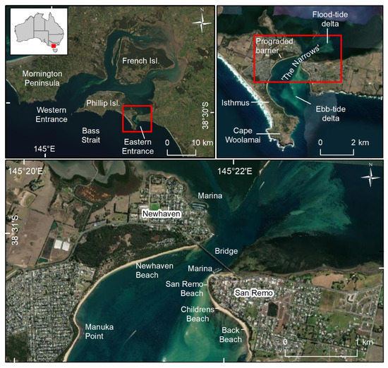 36]. Sandy beaches intercalated by headlands and rock platforms are found on both sides of the Eastern Entrance, which funnels to approximately 450 m wide forming the scour channel known as ‘The Narrows’ between the towns of San Remo, on the mainland and Newhaven, on Phillip Island. This channel marks the division between two secondary-level sediment compartments used for management and planning purposes in Australia [