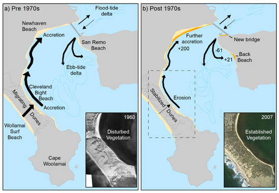 36], and their mobility led to large amounts of sand being supplied from Woolamai Beach to the Cleveland Bight Beach, which prograded up to 80 m from 1867 to 1960. The available sand was transported via longshore currents supplying material for the downdrift shores all the way to Newhaven Beach (