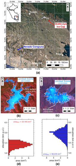 Setting of (a,b,d) the Quelccaya Ice Cap and (a,c,e) Nevado Coropuna within (a) southern Peru, (b,c) false-color composite (SWIR2-NIR-Green) Landsat images of the two ice masses overlayed with their extents in the Randolph Glacier Inventory (RGI), and (d,e) area-elevation distributions of the two ice masses from the RGI.