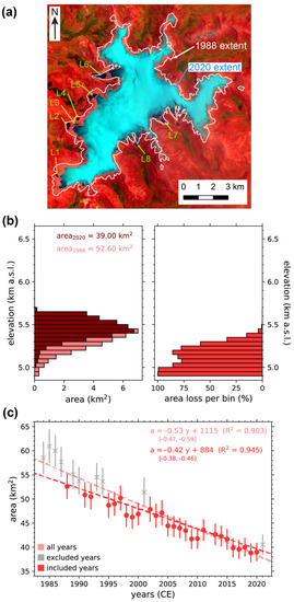 Changes at the Quelccaya Ice Cap (a) in map view, (b) with respect to elevation in 50 m elevation bins, and (c) over time. The Landsat scene for (a) is a false-color composite of the scene with the minimum area in 2020 (29 October), and the white outline is the 1988 extent for the scene with the minimum area (3 September). The green arrows indicate eight proglacial lakes (L1 through L8) that have emerged within the 1988 extent. In (c), ten years with anomalously larger ice cap areas are excluded (gray x’s), and linear regressions results are displayed for the remaining 22 years and the entire dataset, including the 95% confidence intervals inside the square bracket. The 2-σ uncertainty intervals are indicated by the error bars.