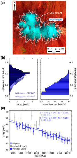 Changes at Nevado Coropuna (a) in map view, (b) with respect to elevation in 50 m elevation bins, and (c) over time. The Landsat scene for (a) is a false-color composite of the scene with the minimum area in 2020 (15 December), and the white outline is the 1988 extent for the scene with the minimum area (29 November). In (c), six years with anomalously larger ice cap areas are excluded (gray x’s), and linear regressions results are displayed for the remaining 22 years and the entire dataset, including the 95% confidence intervals inside the square bracket. The 2-σ uncertainty intervals are indicated by the error bars.