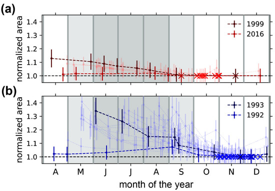 Comparison between estimated glacial extents of two adjacent years at (a) the Quelccaya Ice Cap and (b) Nevado Coropuna. The glacial extent for the younger year is anomalously large, and it was excluded from the linear regression analysis.