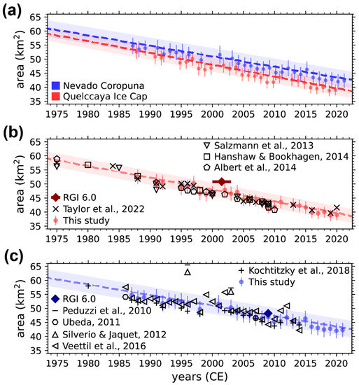Evolution of the Quelccaya Ice Cap and the glaciers on Nevado Coropuna (a) compared to each other and compared to previously published studies for (b) Quelccaya and (c) Coropuna. Only the included years from Figure 2 and Figure 3 are displayed, and the linear regression model for each ice mass is included. Shading around the linear regression models represents the average 2-σ uncertainties in area measurements.