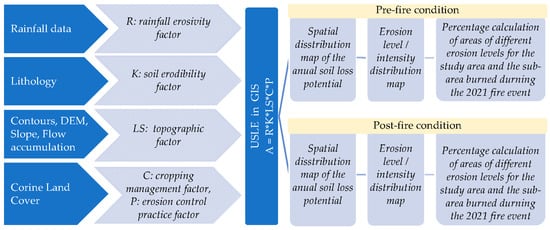 After the estimation of each of the factors, the factor layers were imported in a GIS database and the USLE equation was calculated. In this way, raster maps of soil erosion potential were generated, and then annual soil loss values were calculated for the study area under both natural and post-fire conditions. The study area was classified into three groups of erosion intensity (the low erosion level class with soil loss values less than 9 t/ha/year, the moderate erosion level class with soil loss values between 10 and 36 t/ha/year and the high to extremely high level class with values higher than 37 t/ha/year) and changes in soil loss potential because of the forest fires were estimated. Moreover, calculations regarding the erosion level were implemented for the burned, after the 2021 wildfire, sub-area. A schematic representation of the methodology followed is presented in Figure 2.