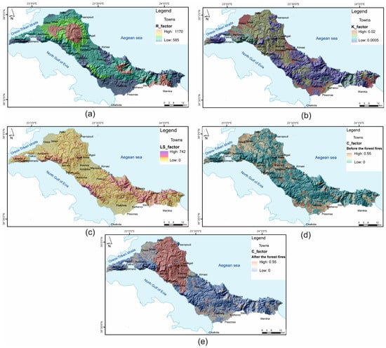 This study focused on the calculation of the soil erosion potential and the identification of critical areas for soil conservation measures. For this purpose, the annual soil loss was estimated with the use of USLE that multiplies five determinant factors. The maps of the spatial distribution of the USLE factors’ values are depicted in Figure 3a–e. Additionally, maps of both soil loss potential and erosion intensity were constructed for the study area, as well as for the sub-area burned after the 2021 mega fire.