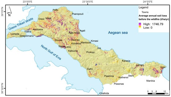 The aim of this paper is to assess the soil loss potential in the northern part of Evia Island (Central Greece) both before and after the devastating forest fire event of 2021. The estimation was performed with the use of the simple, robust and widely applied Universal Soil Loss Equation (USLE) [48] in a GIS environment. This is the first attempt of soil erosion potential assessment with the application of the USLE methodology in the study area. The mean and maximum annual average soil loss values under natural (pre-fire) and post-fire conditions were estimated and compared, while predictive spatial distribution soil erosion maps were compiled based on the input factors. The analysis allowed us to assess the soil erosion level not only within the northern part of Evia but also separately for the burned sub-region, indicating the areas of priority regarding the erosion control measures that are required to be taken.