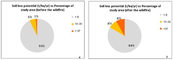 Soil loss potential for the total study area (a) before the wildfire and (b) after the wildfire.
