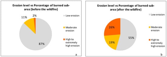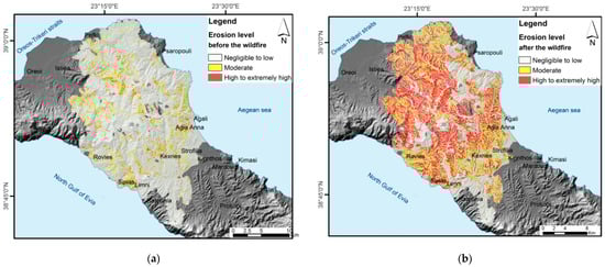 Erosion level for the fire-affected sub-area (a) before the wildfire and (b) after the wildfire.
