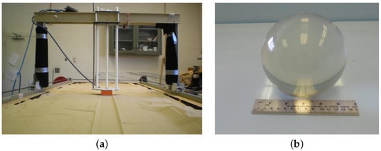 (a) Laboratory apparatus comprised a sand box and the high-frequency GPR (orange box) maintained on the sand surface by an automated transverse support. The size of the box in the picture is 1.2 m horizontally and 4 m in the vertical direction; (b) soda lime glass sphere of 0.12 m diameter buried in the sand box presented in full view of the experiment in (a).