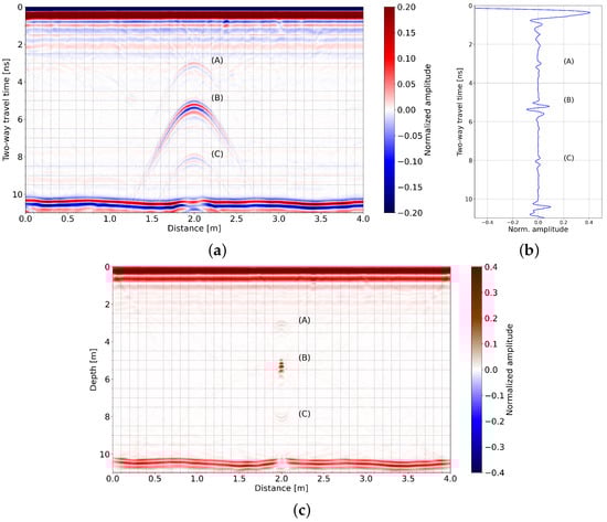 Hyperbola (A) correctly migrated through Stolt migration [34] with a velocity estimated at m/ns. Hyperbola (B) correctly migrated using an estimated velocity of m/ns, as presented in Figure 2c, corresponding to the migrated radargram. In this figure, hyperbola (C) transformed into a “smile” (convex hyperbola), indicating that m/ns is overestimated for this hyperbola. It correctly migrated for a velocity m/ns. Using the sphere depth and diameter, velocities provide a dielectric permittivity of for the soda lime glass, in agreement with the literature [33]. It confirms that (B) reflection is associated with the bottom of the sphere using ray-tracing mathematics.