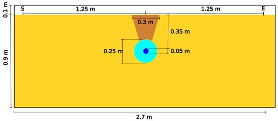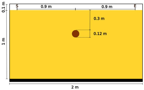 Geometry of the first model used for gprMax simulations. A 0.1 m layer of air (white) overlies a homogeneous material (yellow colored) with 0.19 m/ns velocity, in which a 0.06 m radius cylinder (brown) characterized by a velocity of 0.11 m/ns is embedded at 0.3 m depth. A 0.05 m PEC layer (in black) is placed at the bottom of the model. Traces are simulated by considering antennas moving every 5 cm from point S to E.