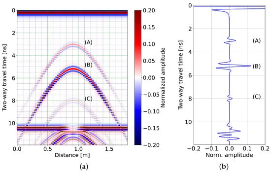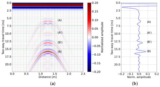 (a) Radargram obtained using a 500 MHz Ricker source for the geometry of Figure 7; (A)–(B’) reflections are described in the text. (b) Trace simulated at 1.25 m from the beginning of the profile (see correspondence in (a)).