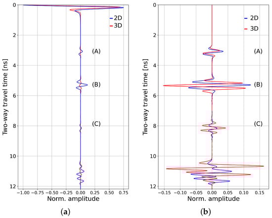 Figure 5 compares the traces in the 2D (blue) and 3D (red) cases. For comparison purposes, we scaled up the amplitude of the 3D trace to obtain either the same direct wave amplitude in both traces in Figure 5a or the same reflection (A) amplitudes in Figure 5b. In Figure 5, we observe that the amplification effect (compare reflection (A) with (B)) is present for the sphere as well as for the cylinder. The phenomenon was twice as strong for the sphere than it was for the cylinder. Comparing 2D and 3D cases, the (B) reflection polarities are the inverse of each other, as is also visible in the laboratory data (Figure 2). The explanation of this feature is beyond the scope of this paper.