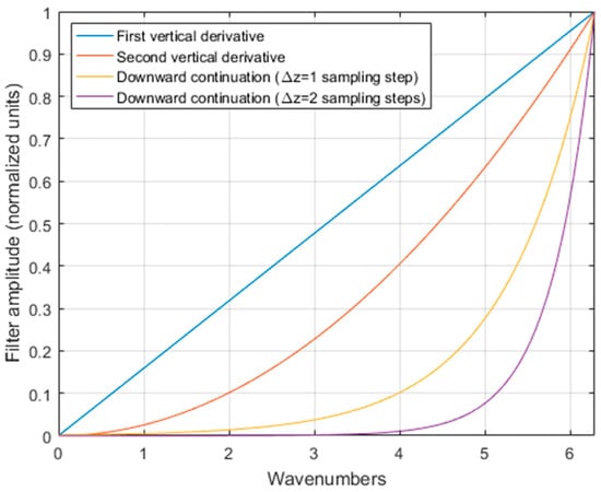 The data resolution is primarily dependent on the acquisition altitude; therefore, a filtering method highly appropriate for enhancing aeromagnetic data is the analytical downward continuation []. This process enables estimation of the magnetic field intensity at a lower altitude than that actually measured, provided it is still in the harmonic (source-free) region. This condition is certainly valid over ocean areas if the final continuation altitude is at sea level. The downward continuation filter enhances the high-wavenumber portion of the spectrum, as does the differentiation filter (Figure 1). In fact, the computation of the vertical derivative, or its experimental evaluation, is used since many decades for the analysis of the magnetic and gravity fields []. Downward continuation is an unstable operation; thus, the resulting map may show a rather low signal-to-noise ratio. However, several stabilized algorithms have been proposed in recent decades [] and good results can be obtained even if the altitude difference is equal to several times greater than the magnetic grid sampling step, as long as the final altitude does not violate the harmonic region boundary.